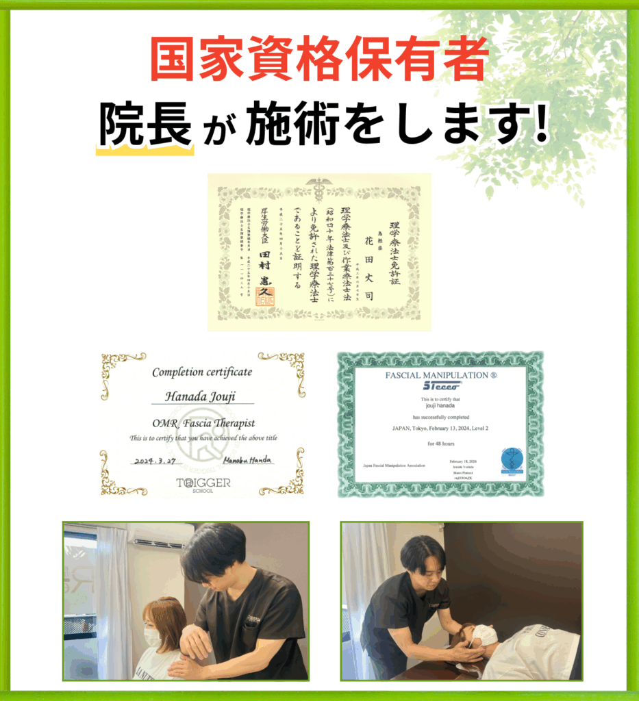 私は「この技術なら少ない回数で痛みを改善出来る」と確信し、《筋膜》について何年も学び続け、本物の技術を学びたいと思い、日本中でも高い筋膜技術を持つ師のもとへ行き、認められるまで技術を追い求めて、みなさまのお力になれる技術を習得しました。